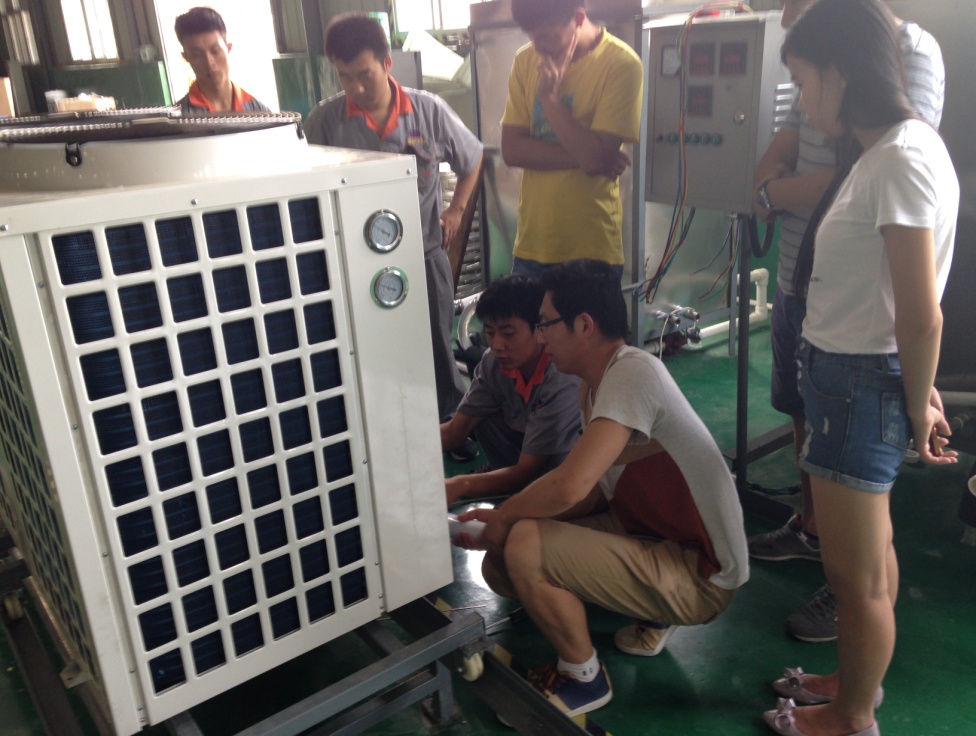 随后,贾部长多次带领我们参观公司的生产车间,参观空气源喷焓型低温热泵机组和复叠型超低温热泵机组的具体生产流程以及讨论热泵的结构布置,并进入热泵综合性能实验室,了解了实验台的具体布置及控制软件的操作过程。