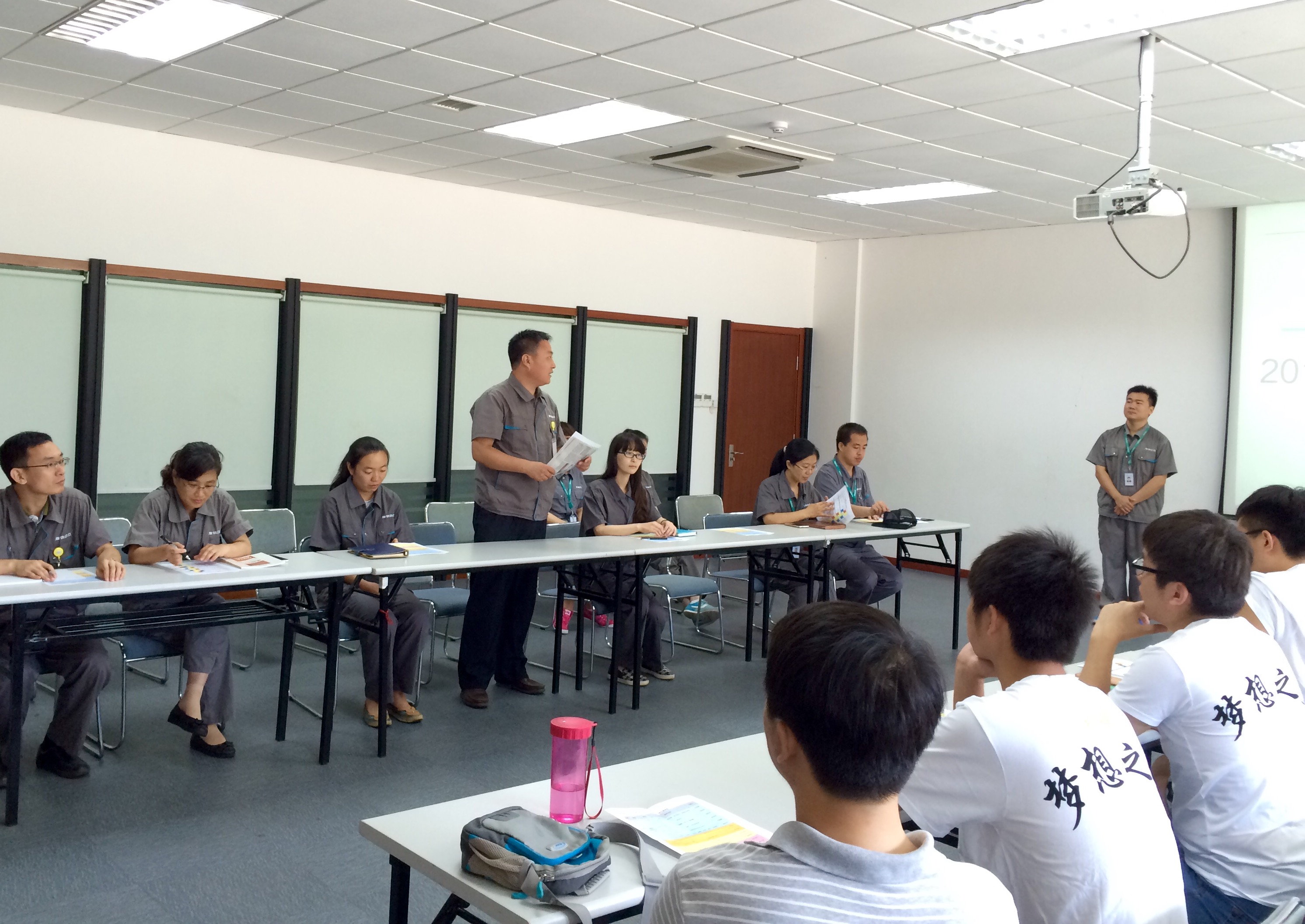 欢迎会结束之后,海信日立公司人力资源部张经世专员对本次实践的内容计划和规章制度进行了详细讲解。根据安排,本期夏季营包括见面日(meeting day)、实践日(practicing day)、技术日(utilizing day)、应用日(application day)和总结日(summary day),每天的活动安排各有侧重。为更好的发挥出每一名成员的能力,本期夏季营三十余名成员被分为五个小组,每支小组平行展开实践活动,在实践活动的最后一天以小组为单位进行总结总结展示。本着理论与实践相结合的宗旨,实践内容从理论学习和实际操作共同展开。一方面,公司安排了《海信日立情况及成人漫画》《精益生产》《多联机的应用》和《暖通空调行业的发展趋势》四门课程;另一方面,夏季营成员须前往制造部、品保部(整机)和品保部(部品)的车间进行参观、学习和动手操作,加深对理论知识的理解,丰富对多联机空调零部件和制造过程的认识。