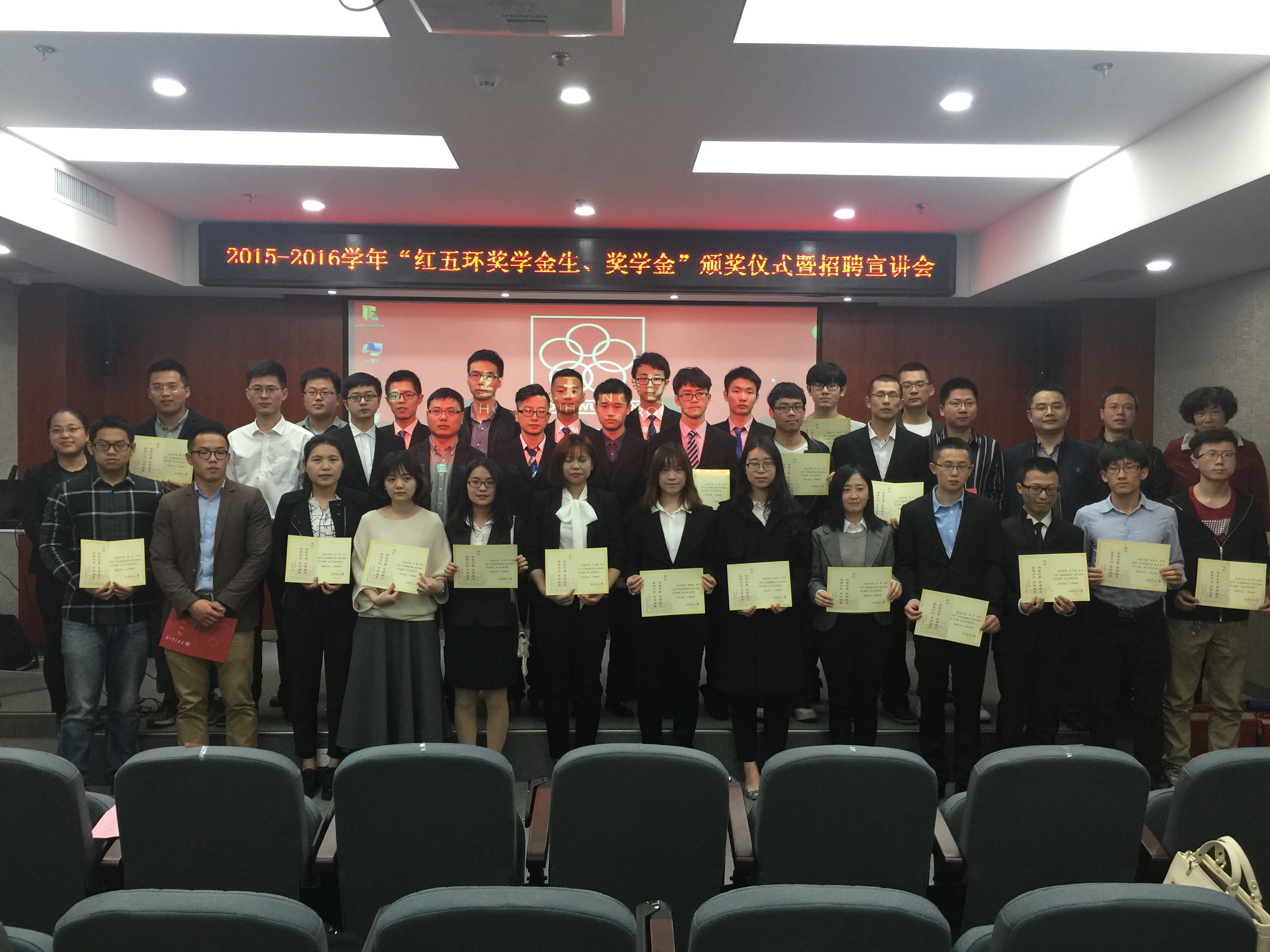 宣读了表彰决定。会议决定,授予刘小琴等6名同学“红五环奖学金生”荣誉称号,并向程军明等25名同学颁发“红五环奖学金”。随后,延卫教授同倪应华教授、李晓梅教授、苏沁女士等一同为获奖学生颁奖。