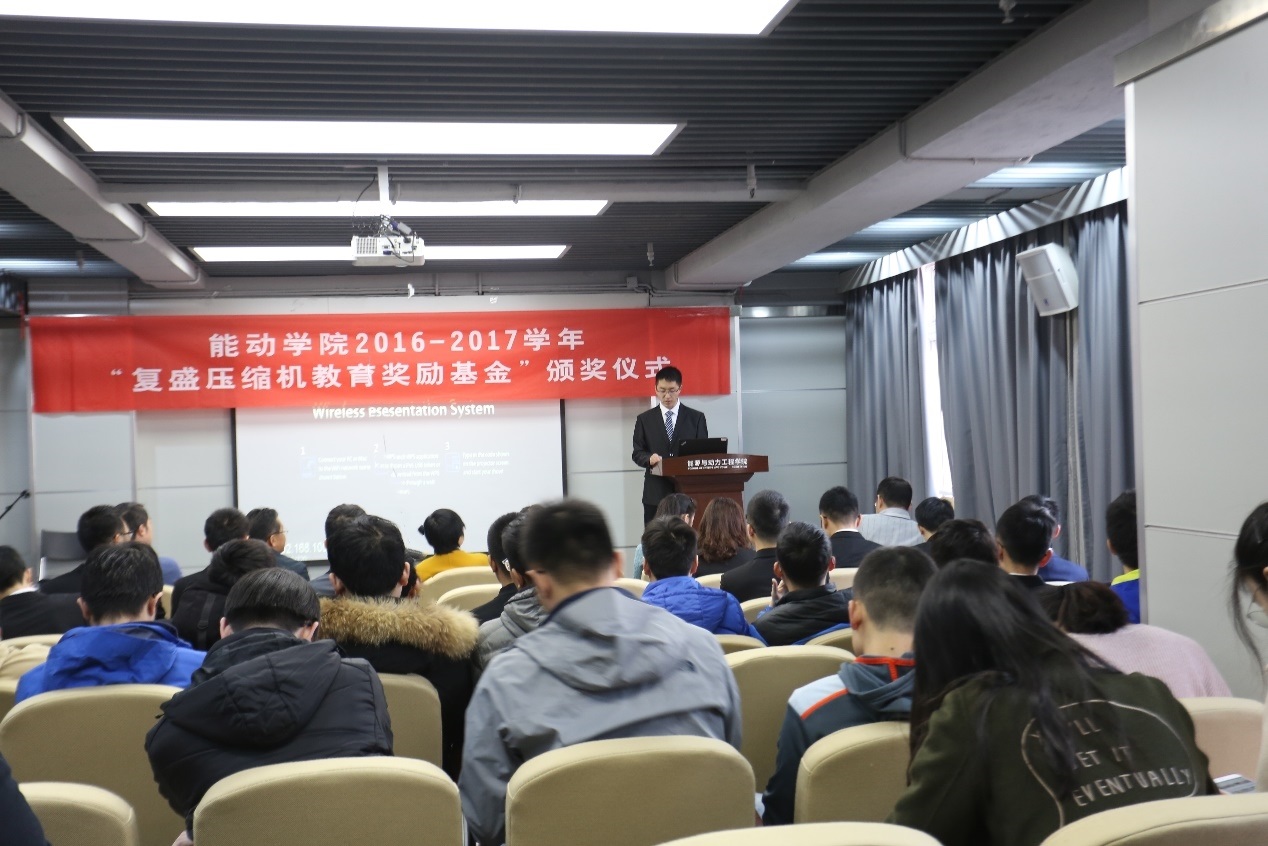 压缩机系83级校友。他先对各位获奖同学表示了祝贺,然后介绍了复盛公司的具体情况,欢迎各位优秀学子毕业后能去复盛压缩机工作,为我国压缩机事业的未来发展做出贡献。