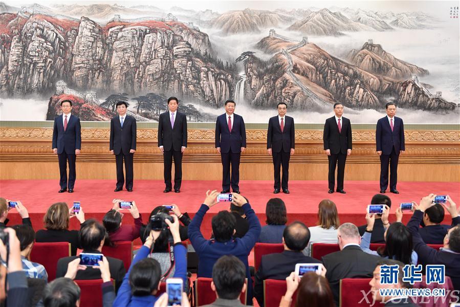 10月25日,刚刚在中共十九届一中全会上当选的中共中央总书记习近平和中央政治局常委李克强、栗战书、汪洋、王沪宁、赵乐际、韩正在北京人民大会堂同采访十九大的中外记者见面。新华社记者马占成 摄