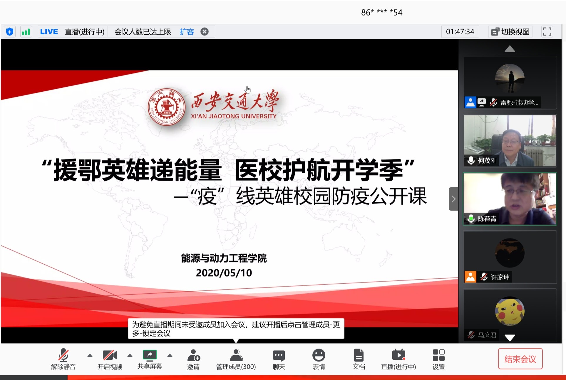 迎来了首批1200余名学子返校。为普及校园防疫知识,保障返校学生安全,加强爱国主义教育,5月10日上午学院开展主题为“援鄂英雄递能量,医校护航开学季”的防疫公开课。此次公开课由三部分内容组成:陕西省首批援鄂医疗专家、西安市第四医院呼吸科主任陈葆青主任医师授课,热流科学与工程系唐桂华教授作为导师代表作分享,学院分党委书记何茂刚教授总结讲话。学院首批返校学生以及未返校学生通过加入腾讯会议和观看直播方式参加公开课,学院分党委副书记韦娜主持。