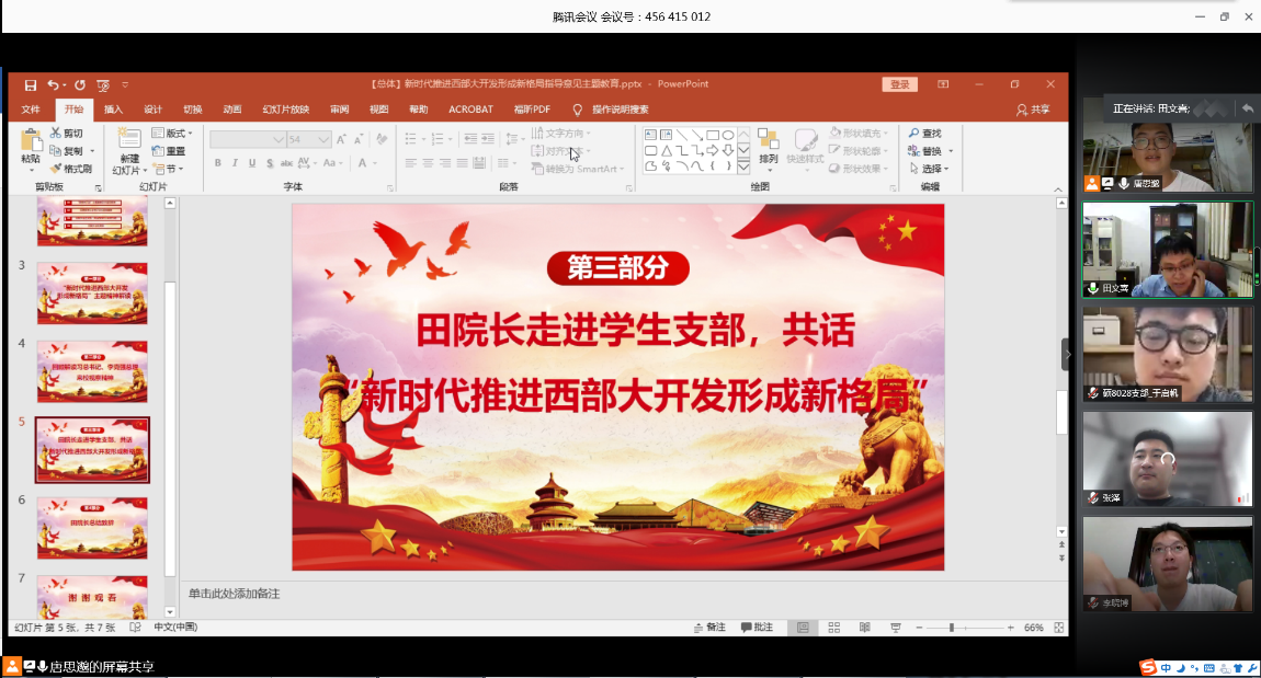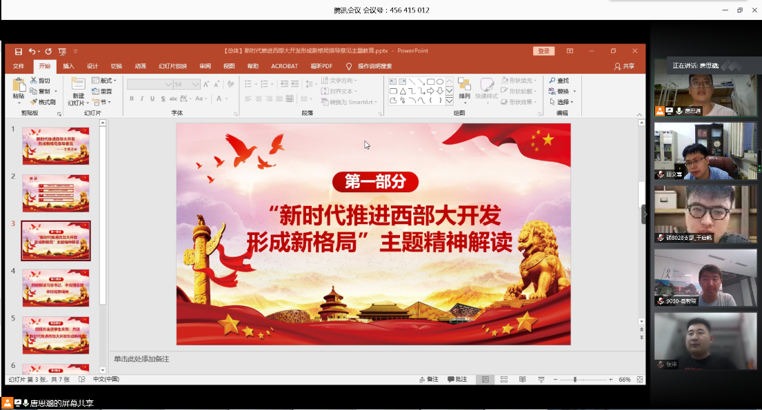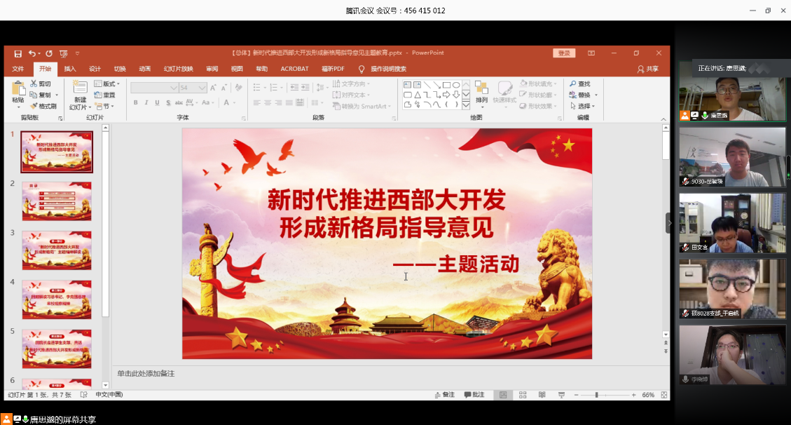 接下来,硕9030班党支部杨宇鹏同志为大家深入解读了2020 年制定的《关于新时代推进西部大开发形成新格局的指导意见》。西部大开发是中国经济高质量发展的内在需要、是全球经济再平衡的客观要求。指导意见指出西部大开发要做好大开发、大开放、大保护、大安全四篇大文章,这是新格局、新态势。