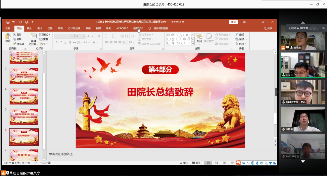 最后,田文喜副院长对此次生活会进行了简要的总结。2000年,我国正式吹响了西部大开发的号角,20年来,在国家重点扶持和西部地区自身努力下,西部大开发成效显著,生态保护、环境治理、基础设施、科技教育、特色优势产业等取得积极进展,西部地区居民的获得感、幸福感、安全感得到大幅提升。田院长建议即将毕业的研究生,要高瞻远瞩,顺应历史发展潮流,鼓励大家响应国家的号召,到祖国需要的地方去,站在新的历史起点上,创造属于我们这一代人的价值和功绩。最后希望大家都能快快乐乐地生活,快快乐乐地科研。