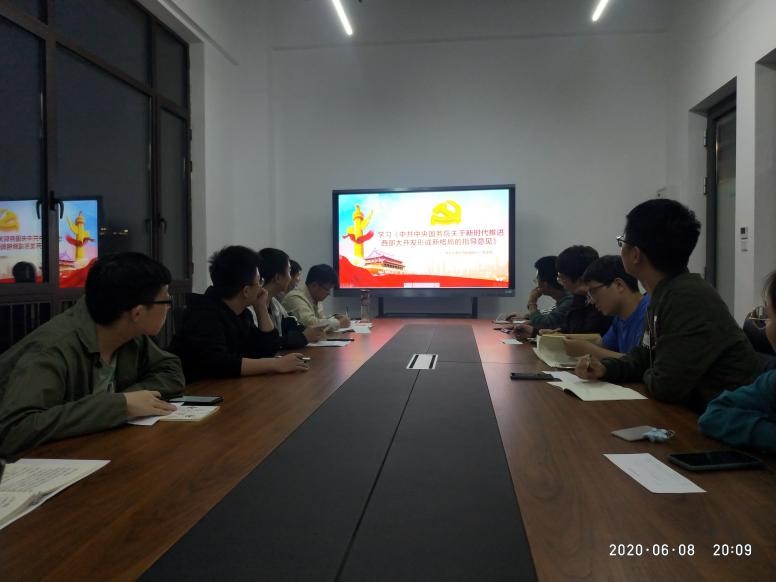 硕9025党支部于创新港1-5189召开“学习西部大开发新格局指导意见”专题组织生活会,支部成员对《中共中央 国务院关于新时代推进西部大开发形成新格局的指导意见》及部分“两会”内容进行认真学习和研讨交流。