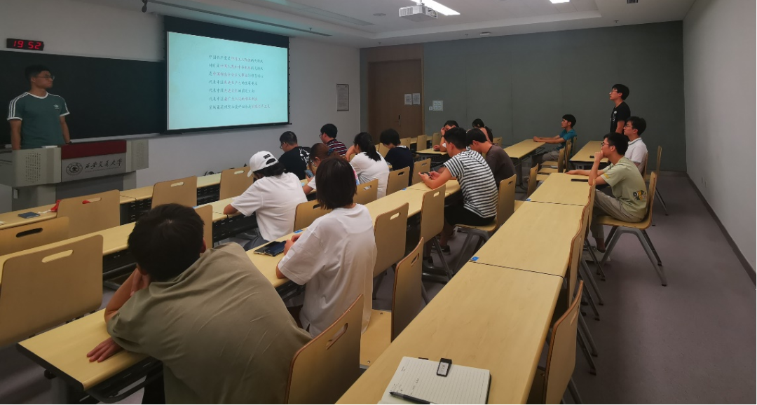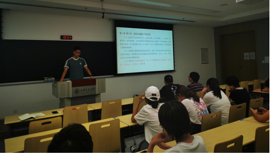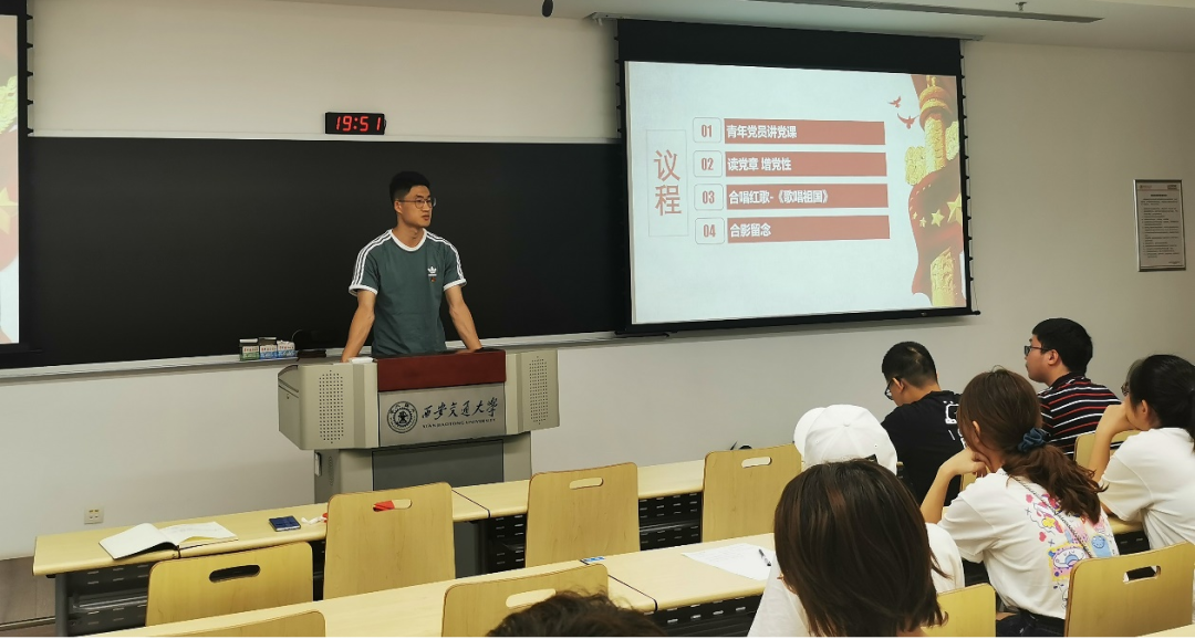 硕0036党支部在1-4055教室开展了组织生活会。本次组织生活会流程包括青年党员讲党课、读党章增党性、合唱红歌、合影留念四部分,会议由党支部书记董博同志主持,硕0036全体党员及积分分子均参加此次会议。