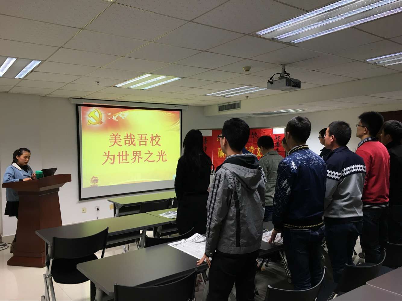 美哉吾校,百廿风云辉煌路。“青年之模楷,邦国之荣华”,交大学子之荣光,“英俊济跄,经营四方”交大学子之胸怀,“实学培国本,民族得中兴”,交大学子之使命。这亘古的校歌,声声敲在支部学子的心中,音音荡漾在支部学子的脑海,经过全体支部成员起身齐唱校歌,支部成员再一次经历了心灵的震撼和洗礼。至此,第一部分,“献声交大”告一段落。