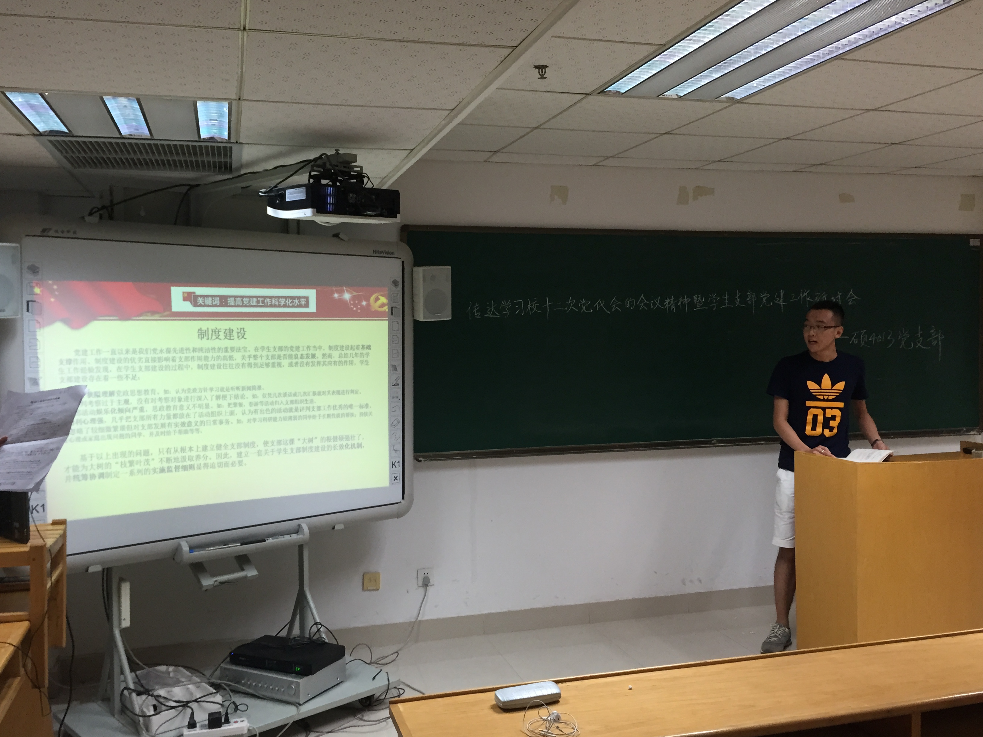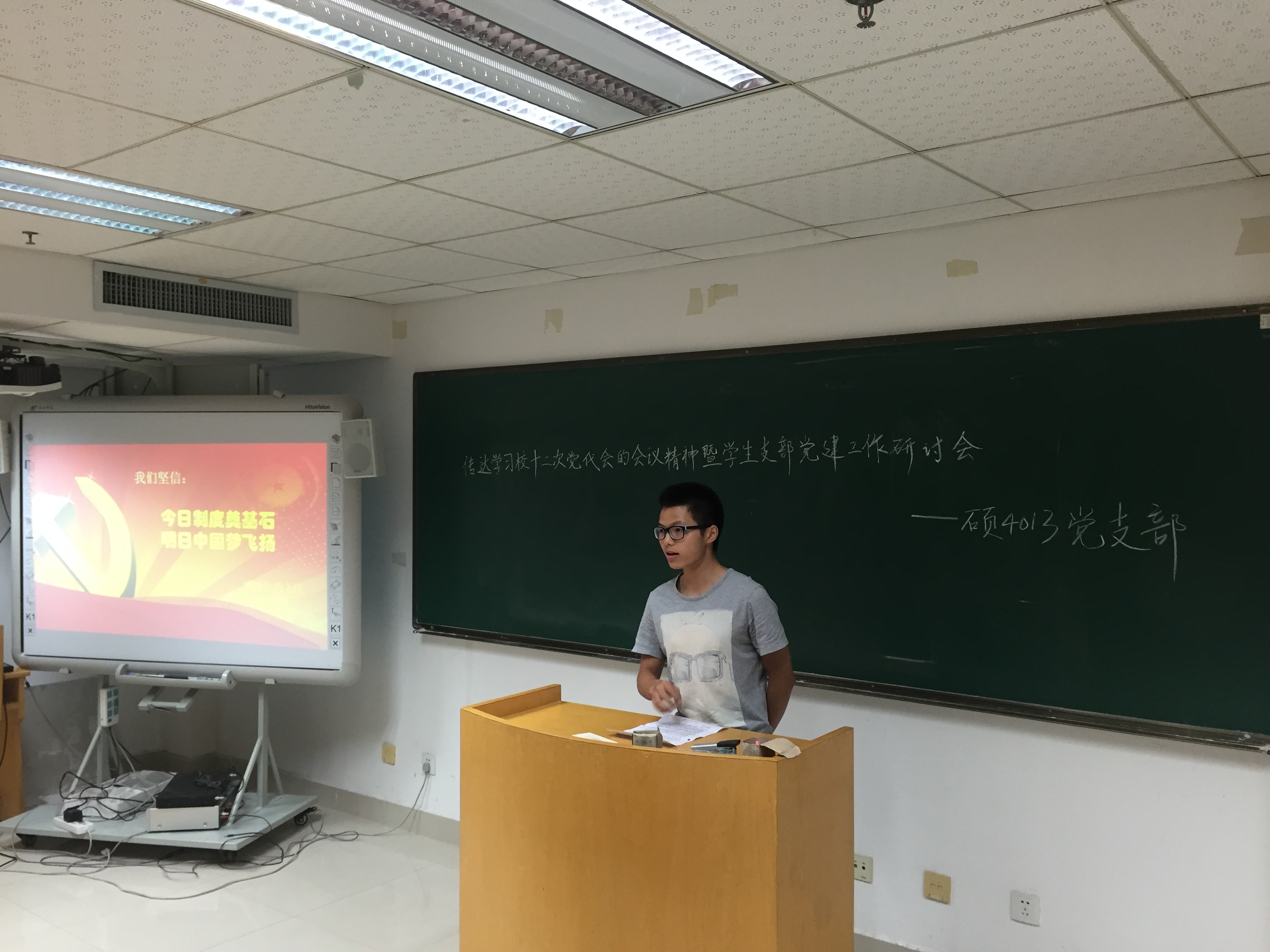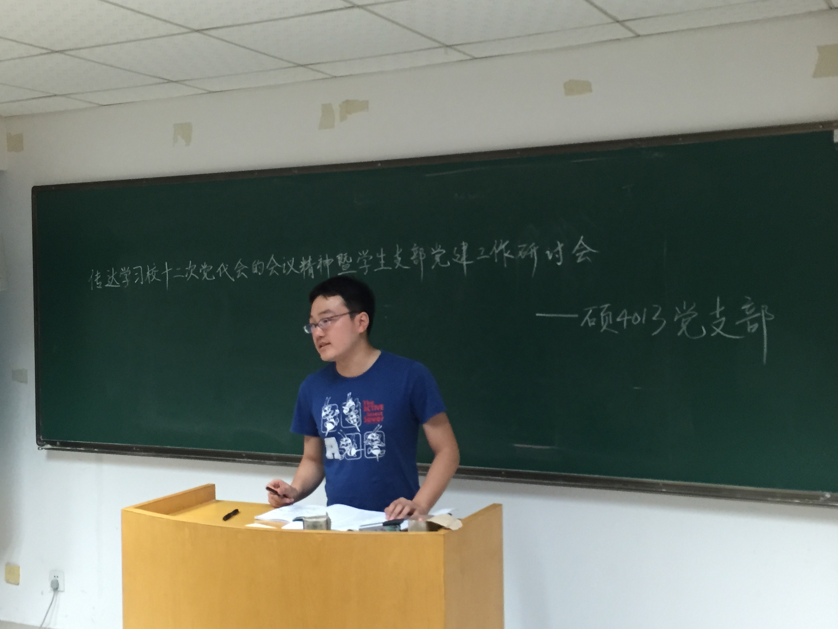 支部书记王立典紧紧围绕本次党代会提出的“提高党建工作科学化水平”这一要点展开论述,结合学生型党支部这个实际,要求支部把制度建设作为工作重心,客观认识党建工作,并完善考核制度,创造性地提出了“支部制度化,制度重量化“的党建理念和目标。这是学生型党支部在制度建设上的一次新尝试,也是践行此次大会提出的“深化改革,全力创新”方略的新探索。支部副书记郑召利则和大家分享了一些关于学校规划建设,工作重心及国际交流等较宏观方面的心得体会。