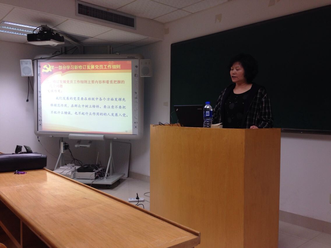 张亚玲老师从中央对发展党员工作提出的一系列新部署新要求开始解读,强调了十八大以来党中央高度重视党员队伍建设,与支部委员们一起学习了新修订的发展党员工作细则,总结出了修订发展党员工作细则的主要内容和着重把握的几个问题。