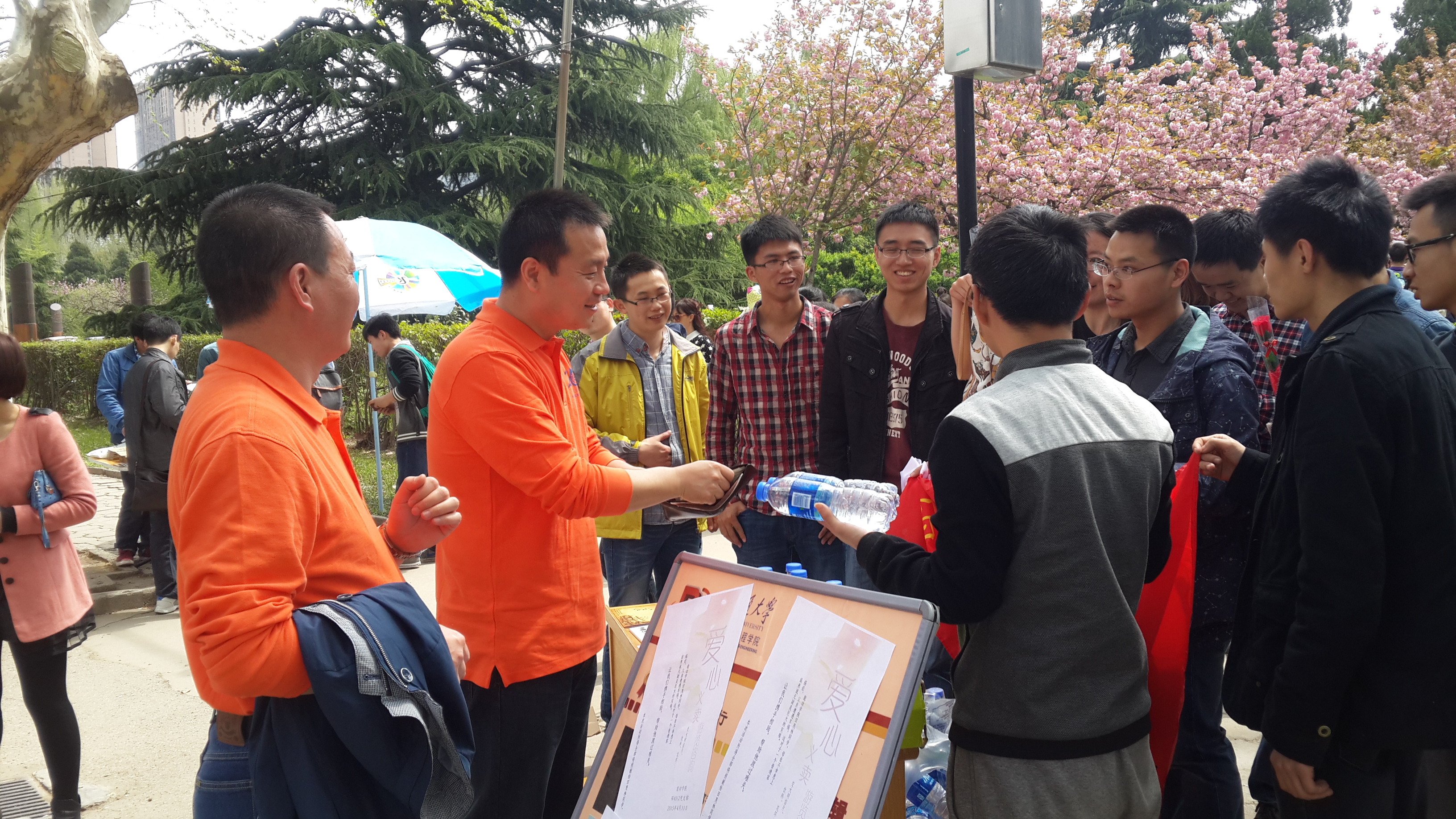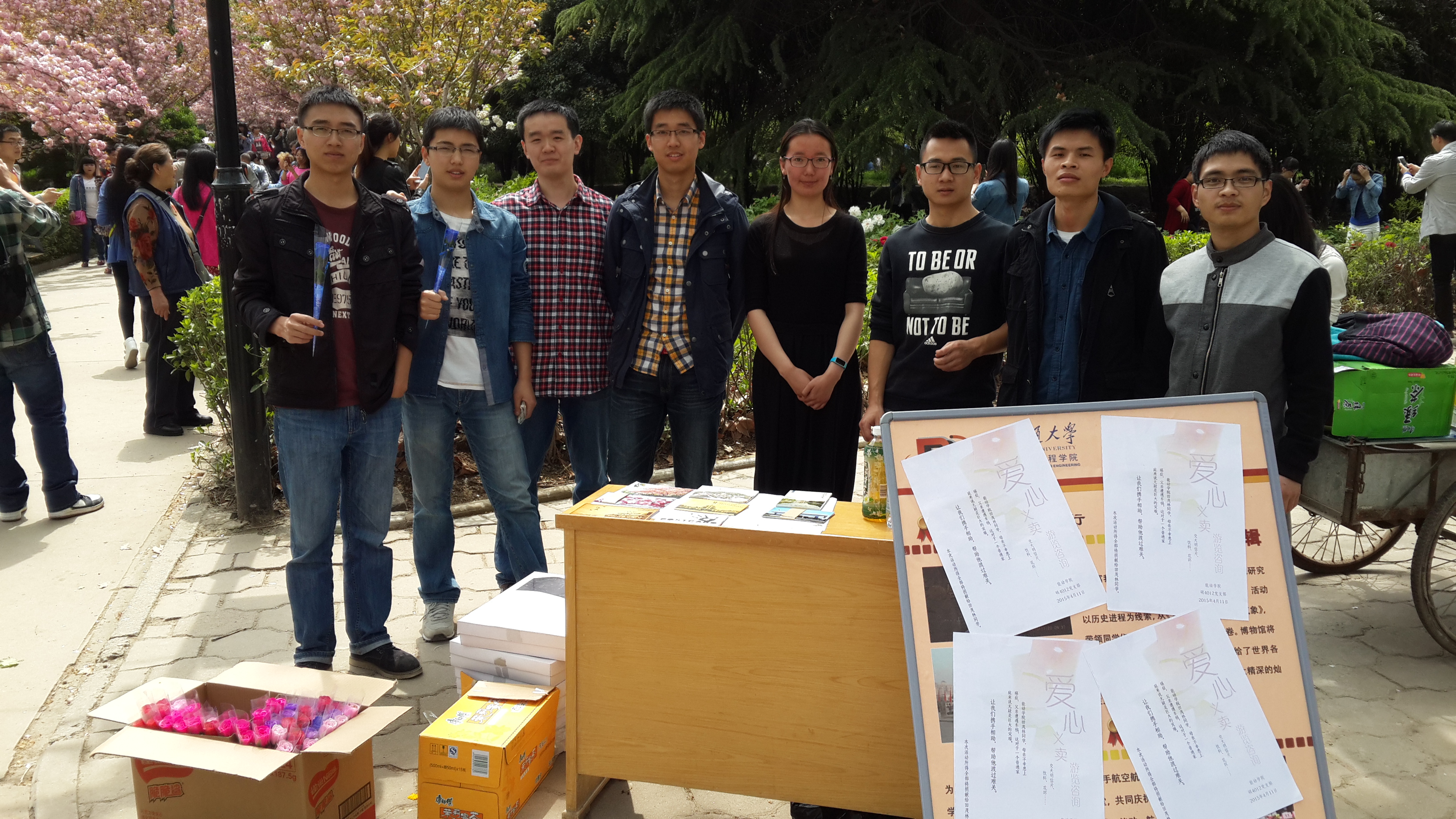 硕4012党支部全体成员来到彭康路与樱花西道交叉口,摆设摊点,为游人提供游览咨询,并同时提供水、交大明信片、花环等物品的选购。这样一个特殊活动的目的是为近日家中遭遇不幸的田茂林师兄募集善款,谨献一份绵薄之力。