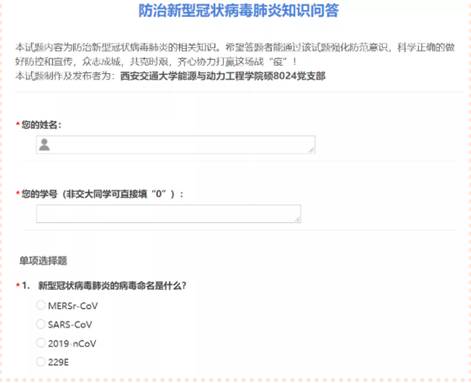 为了能够让同学们更好的掌握防疫知识,硕8024承办了学院研究生支部的“防治新型冠状肺炎”知识竞赛,参加答题的同学们普遍反映,这种方式能让参与者更深刻的掌握肺炎防治知识,扫除了一些知识盲点,能在生活中更全面的防范病毒。