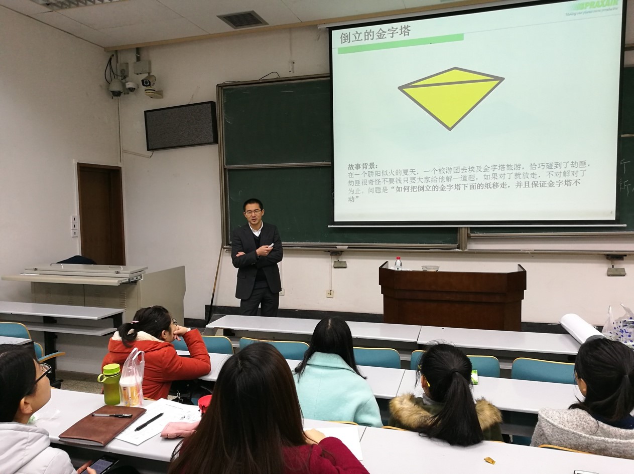 那么,最关键的问题是,我们要如何“创新”呢?霍先生谈到:“创新的第一步,是要明确自己的动机是什么。对于前面的金字塔问题,其实人的动机就是——走,那么根据这个动机,同学们应该会想出更多的办法,而不仅仅是解决把纸从金字塔底抽出来的这一难题题。”而知识、环境、技能、激励同动机一起构成了创新的五大要素。接下来,他进一步讲到,创新有很多技能。技能之一,PISCO思维模式,分别代表purpose,input,solution,choice,optional;技能之二,是观察、联系、提问、交际、试验这五项思考技能;技能之三,名为创新工具箱,包含头脑风暴法、思维导图、发明问题解决理论以及6顶思考帽。
