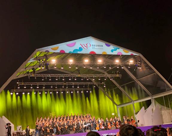 演出于19:30开始,共有13个节目,以肖斯塔科维奇的《节日序曲》开端,欢快的曲子将节日气氛烘托得淋漓尽致;既有歌剧《卡门》合唱选段、勃拉姆斯的《匈牙利舞曲第五号》、莫索尔斯基的《基辅的大门》等国外经典名曲,也有中国人民极为熟悉的《瑶族舞曲》、《山丹丹花开红艳艳》、《青春舞步》和《我的祖国》等经典曲目,更邀请到图瓦共和国恒哈图乐队与西安交响乐团合作,而本次演出的专属舞台由曾为2008年北京奥运会服务的德国户外蓬体建造商打造,各方团队通力合作的演出可谓充满国际化和专业化。