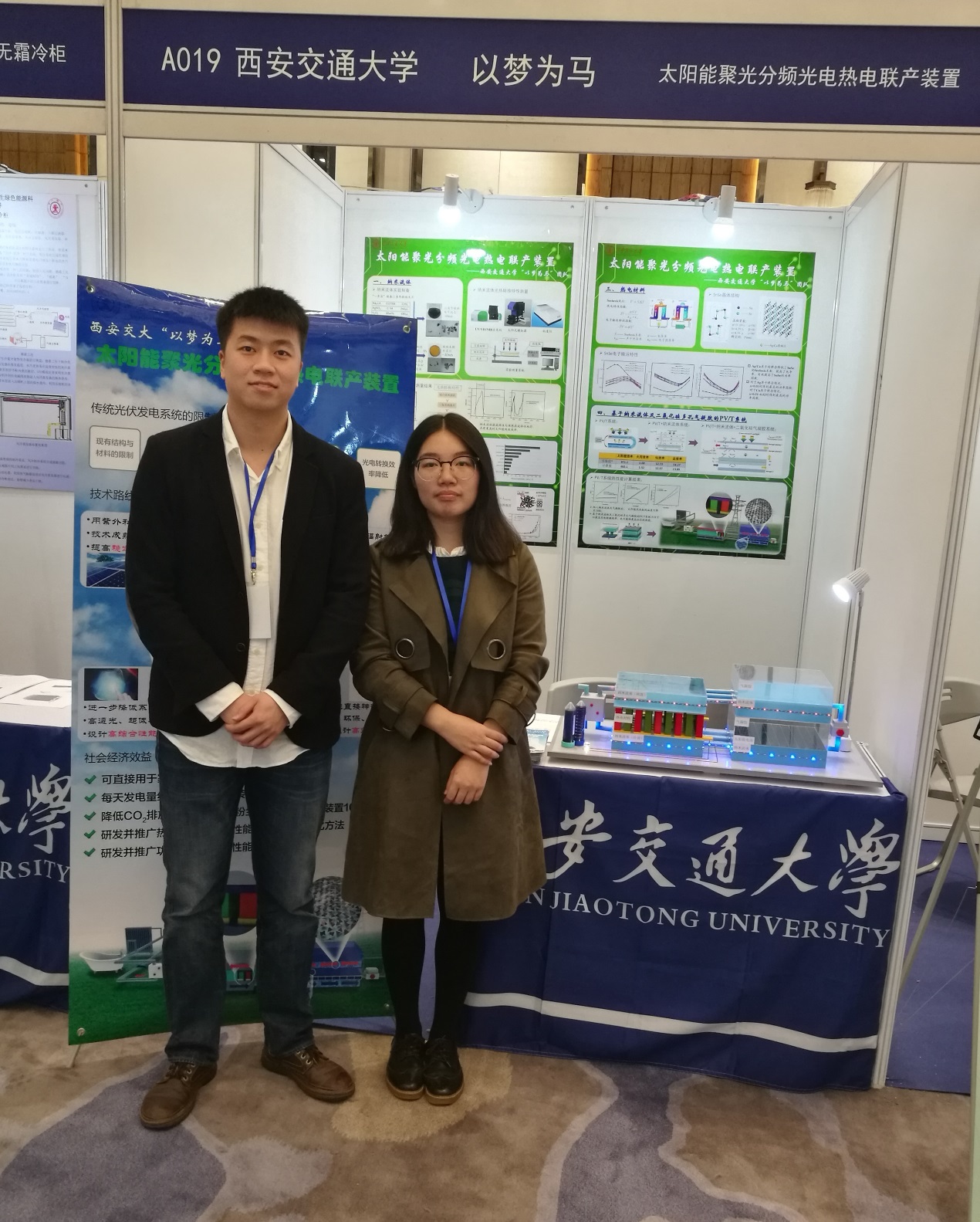 王甜蜜等四位同学组成的“以梦为马”团队凭借“太阳能聚光分频光电热电联产装置”荣获本次大赛二等奖。本项目的目的在于引入热电材料和功能型流体,实现对太阳辐射能量高效分频利用。现有光电转换技术可以有效利用紫外和可见光进行发电,而热电转换技术可以利用其余的太阳辐射光谱进行发电,同时通过功能型流体对太阳能电池进行降温以保持较高的光电转换效率并回收余热,引入纳米多孔气凝胶材料进一步降低系统热损耗,开发一种太阳能聚光分频光电热电联产装置,达到高效全光谱利用太阳能的目的。