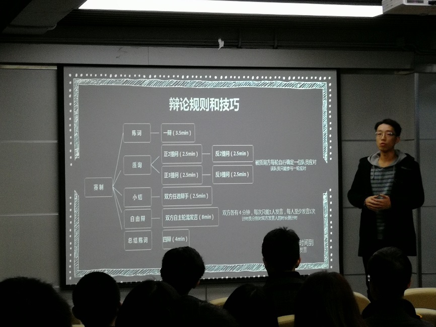 思辩学社的王栋同学,为大家细致讲解了辩论规则和技巧。旁征博引、妙语连珠的他对辩题的破题、立论以及攻守娓娓而谈,最后他也祝愿辩手们能够在本次比赛中有所收获。