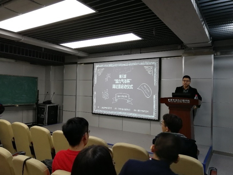 北二楼1402教室举行了辩论赛启动仪式。出席本次仪式的嘉宾有能动研会副主席王新赫师兄以及来自思辩学社的王栋同学,主持人由孙建福同学担任。