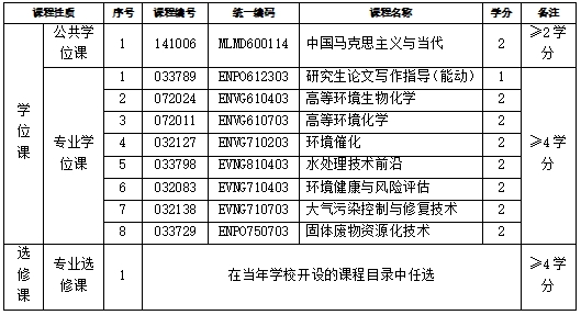 (3)基本能力:掌握科学研究的先进方法,能熟练地应用一门外语进行环境科学与工程专业的学习,具备瞄准国际学术前沿,开展学术研究和学术交流的能力。在环境科学与工程领域内做出创造性成果,具有突出的理论和工程分析能力,具有独立从事科学研究和高等教育的能力。