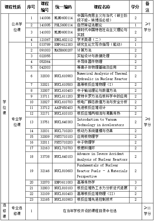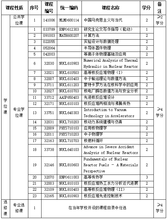 (3)基本能力:掌握科学研究的先进方法,能熟练地应用一门外语进行核科学与技术专业的学习,具备瞄准国际学术前沿,开展学术研究和学术交流的能力。在核科学与技术领域内做出创造性成果,具有突出的理论和工程分析能力,具有独立从事科学研究和高等教育的能力。