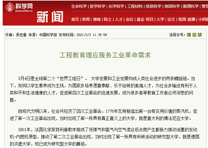 2021年3月3日,我中心吴宏春教授在《中国科学报》发表文章《工程教育理应服务工业革命需求》。3月4日是全球第二个“世界工程日”。 大学发展和工业发展构成人类社会进步的两条螺旋链。当下,如何以学生素养成为主线,为国家多培养愿意奉献、乐于钻研的高端人才,为社会多输送有利于人类和平和生活健康的人才,促进第四次工业革命的迅速发展,成为很多高等教育工作者必须深思的问题。