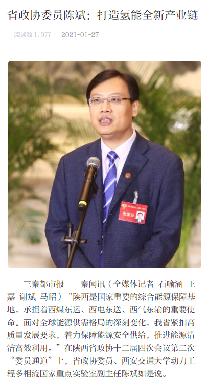 2021年1月27日,在陕西省政协十二届四次会议第二次“委员通道”上,三秦都市报就“打造氢能全新产业链”对我中心的省政协委员、成人漫画 动力工程多相流国家重点实验室副主任陈斌进行采访,陈斌说,能源产业是陕西经济发展的支柱产业,在2060年我国实现碳中和的愿景目标下,陕西应抓住新型能源产业技术发展的机遇,通过能源科技创新驱动能源向绿色低碳转型,转变为我省经济产业升级的动力,不断推动我省能源产业向高质量发展迈出更大步伐。