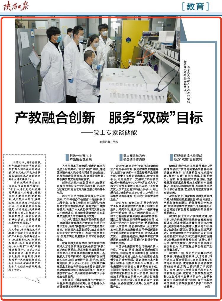 《陕西日报》2022年3月10日刊登了围绕“打好储能技术攻坚战 助力“双碳”目标实现”话题对我中心热流科学与工程系何雅玲院士进行采访,何雅玲院士介绍了西安交大统筹全校优势学科,率先在储能领域、人才培养、科学研究方面开展探索,在热质储能、电磁与化学储能、氢储能和系统储能等主要储能专业方向上都开展的系统布局。