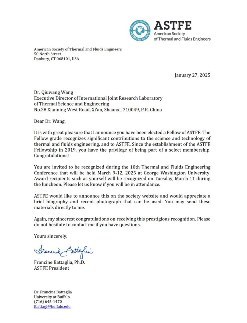 王秋旺教授因其在节能与储能传递过程强化的原理、技术及应用等方面的杰出贡献,入选2025年度美国热流体工程师学会会士(ASTFE Fellow)。这是中国大陆学者首次入选该学会会士,也是王秋旺教授继2019年入选美国机械工程师学会会士(ASME Fellow)之后,入选的又一个重要国际学术组织的会士。